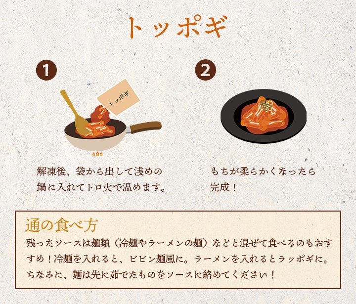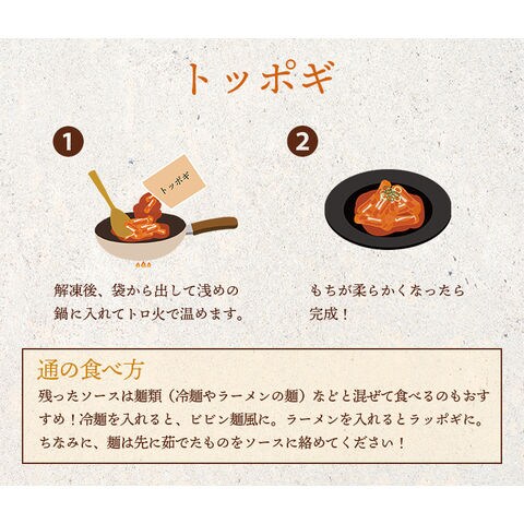 ●トッポギ:もち(国内製造)、コチュジャン、砂糖、米粉、トウモロコシ澱粉、牛風味調味料 / 調味料(アミノ酸等)、酸味料、(一部に小麦・乳成分・大豆・牛肉を含む)