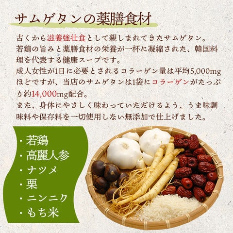 ●参鶏湯:鶏肉(韓国産)、もち米(韓国産)、うるち米(韓国産)、高麗人参(韓国産)、ニンニク(韓国産)、栗(韓国産)、ナツメ(韓国産)、食塩