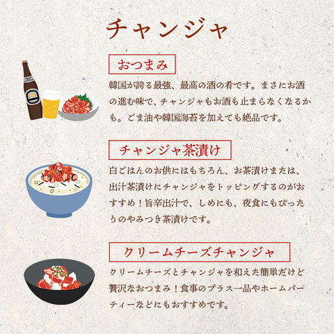 チャンジャはビールのアテ、ごはんのお供に最高です。ゴクリと飲み込むのではなく噛んで、噛んで、噛みまくって味わって下さい。
