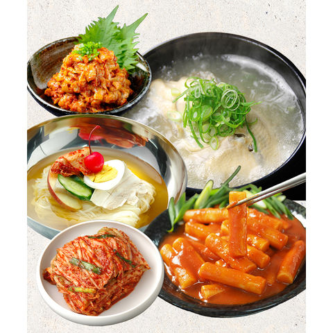 【商品内容】白菜キムチ500g、韓国甘辛棒餅トッポギ700g、韓国高級珍味チャンジャ200g、参鶏湯1kg(レトルト)、韓国冷麺2食