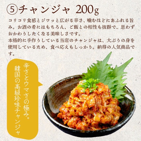 ●チャンジャ:タラの胃(ロシア産)、ニンニク、唐辛子、みりん、ごま油、風味調味料、醤油、鰹風味調味料、塩 / 調味料(アミノ酸)、(一部に小麦・大豆・ごまを含む)