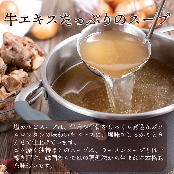 (塩カルビスープ)肉エキス(国内製造)、食塩、動物油脂、砂糖混合異性化液糖、たん白加水分解物、しょうゆ、香辛料、ショートニング / 調味料(アミノ酸等)、酒精、増粘剤(加工デンプン、キサンタン)、カラメル色素、香料、カロチン色素、(一部に小麦・大豆・豚肉を含む)