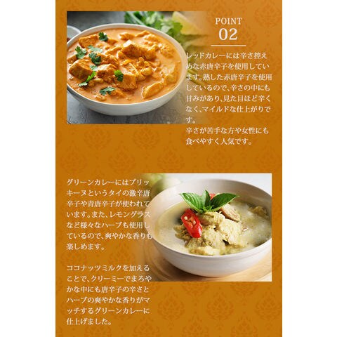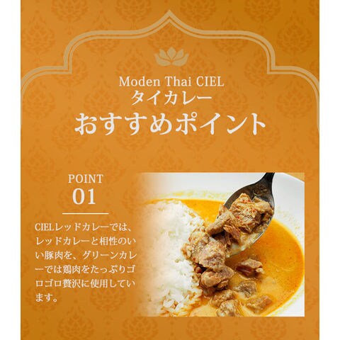 タイの五つ星ホテル元料理長が監修した本格グリーンカレー&レッドカレーです。大阪・新福島にある人気のタイ料理店 Moden Thai CIELで大人気メニューのグリーンカレー・レッドカレーが、この度ご自宅でもお楽しみ頂けるようになりました。