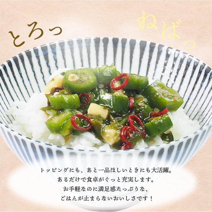 めかぶに加えて、おくら・モロヘイヤ・山芋を合わせ、旨味を引き立てる醤油風味で仕上げました。さっぱり爽やかなしそ味、唐辛子で味を引き締めたピリ辛の2種類セットです。