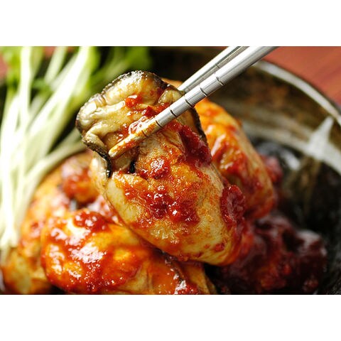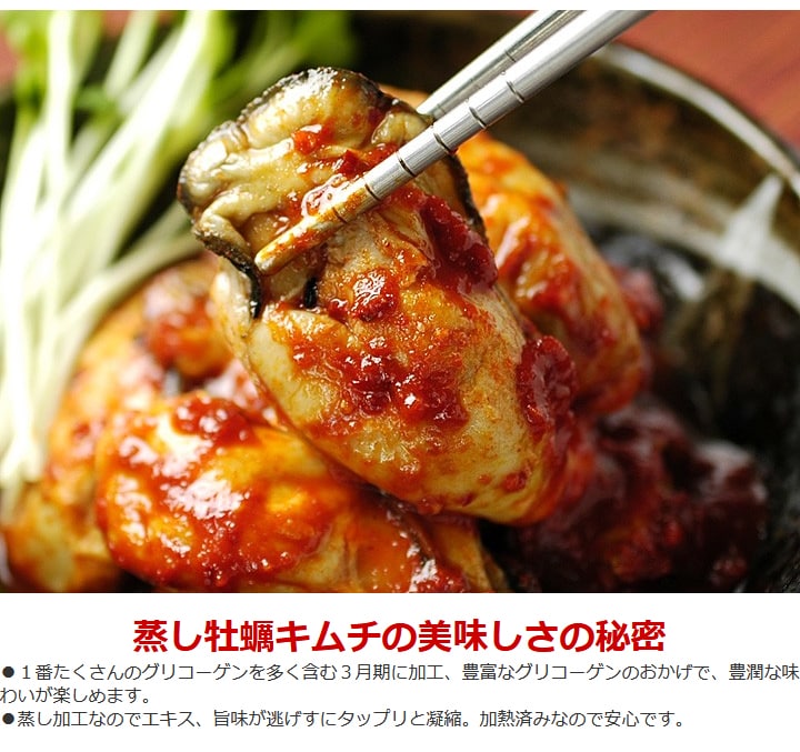牡蠣の粒がそろう冬から春にかけてとれた大粒の牡蠣を選りすぐり、高温で蒸して高速冷凍によって旨みを凝縮させた「蒸し牡蠣」を、キムチに漬けこんだ珍しいキムチです。