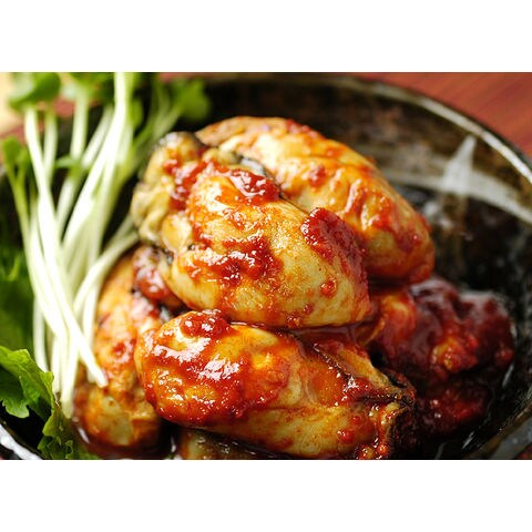 【原材料名】蒸し牡蠣(国産)、唐辛子、醤油、清酒、三温糖、たまねぎ、生姜、にんにく、酢、ごま油、黒ごま、塩、(一部に小麦・大豆・ごまを含む)