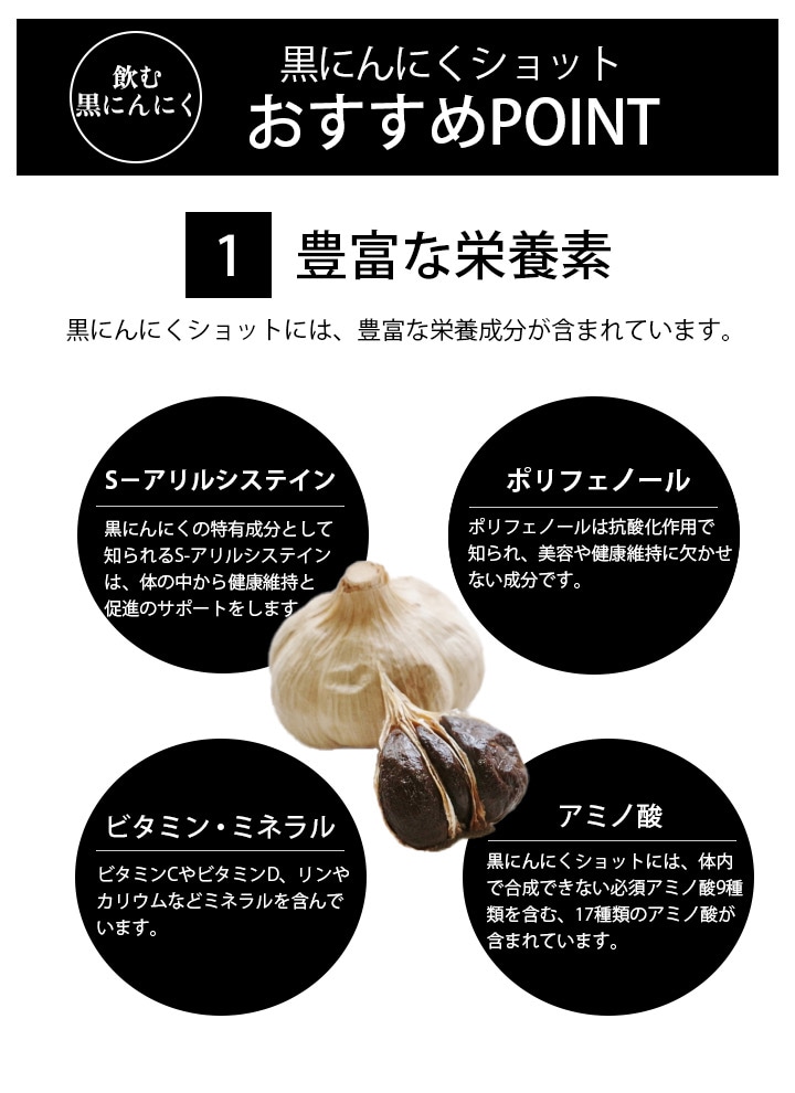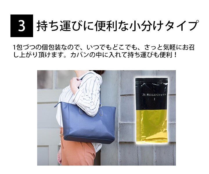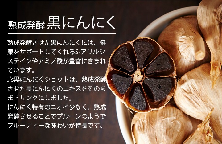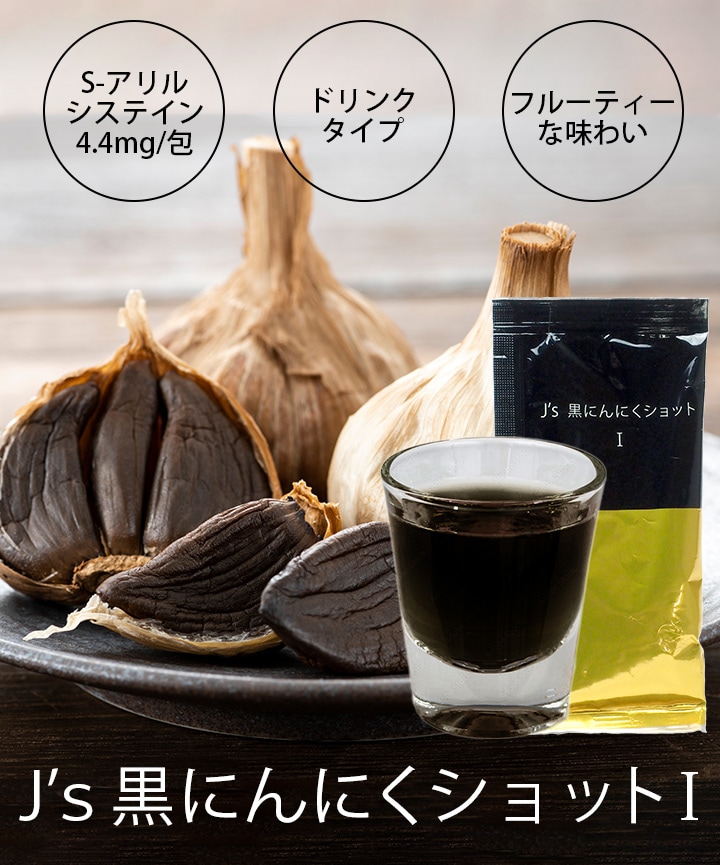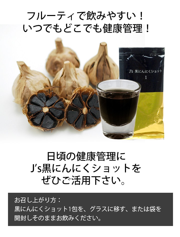 1包40mlに熟成発酵濃縮黒にんにくゼリー約6本分の黒にんにくエキスを配合した、J's 黒にんにくショット I。飲みやすい液体タイプで持ち運びにも便利です。