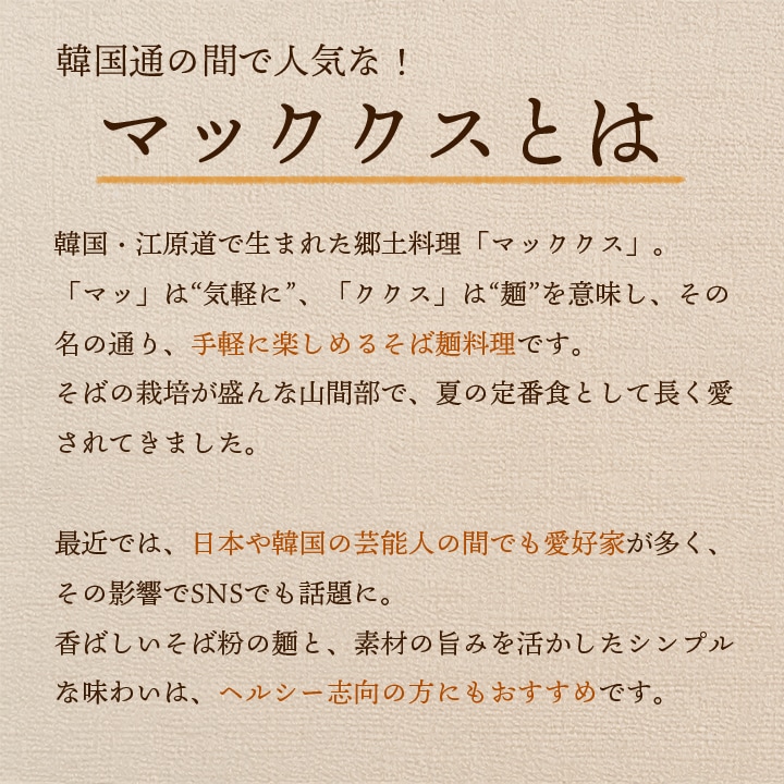 韓国・江原道発祥の「マッククス」は、そばの香りを活かした冷製麺。そこに韓国で人気の「エゴマ油(???)」を合わせ、香ばしさと奥行きを引き出したのが本品「エゴマ油マッククス麺」です。ゆでた麺を冷水でしめ、付属の特製ダレと、芳醇なエゴマ油をからめるだけ。箸が止まらない香りとコク、さっぱりとした後味で、季節を問わずお楽しみいただけます。