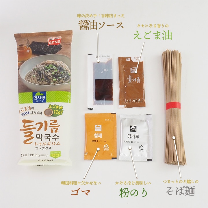 そば本来の風味を損なわないよう麺の配合と乾燥工程にこだわり、タレはカツオと海鮮の旨み効いたさっぱり和風味。仕上げに添付のエゴマ油と韓国海苔を添えれば、まるで現地食堂の一皿に。