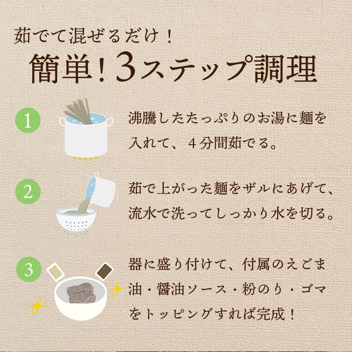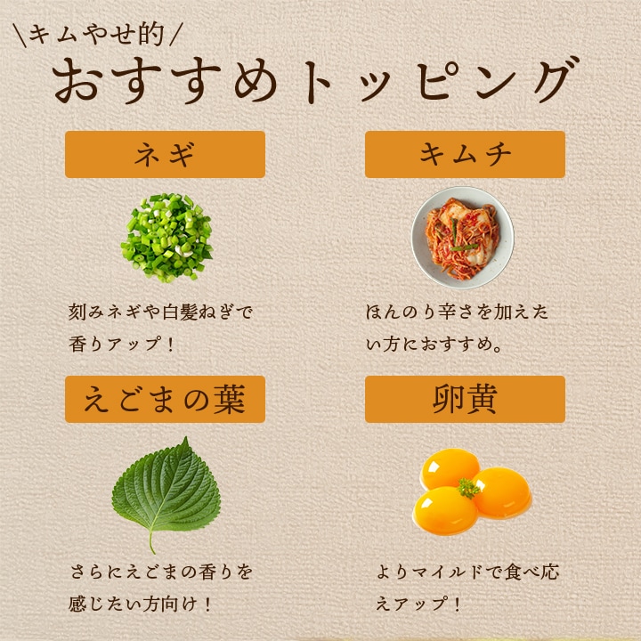 アレンジ自在:きゅうり、白髪ねぎ、キムチ、ゆで卵、ローストポーク/ささみ、焼き海苔、すりエゴマ、すりごまが好相性。