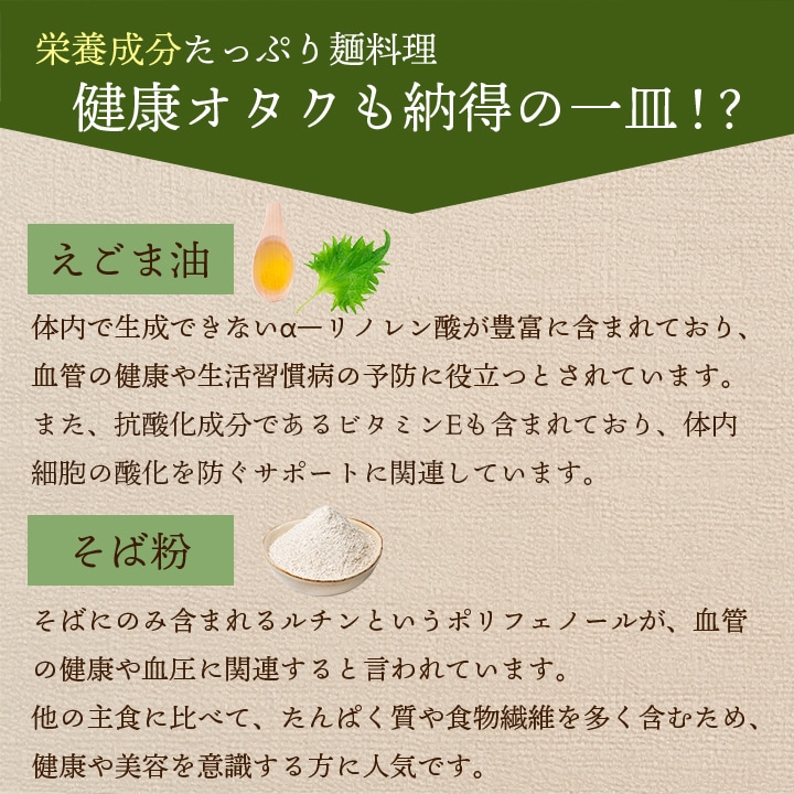 【原材料名】【麺】小麦粉、混合そば粉(そば粉、小麦グルテン)、小麦グルテン、食塩、タピオカでん粉、卵白パウダー、(一部に小麦・そば・卵を含む)【液体調味料】カツオだし汁、しょうゆ、砂糖、ブドウ糖果糖液糖、カツオエキス、海鮮風味調味料(しょうゆ、砂糖、食塩、その他)、クッキングワイン(ぶどう、その他)、食塩、お酢、うまみ調味料/調味料(アミノ酸等)、酒精、着色料(カラメル)、香料(ステビア)、(一部に小麦・大豆を含む)【食用えごま油】食用えごま油【粉のり】乾のり末【ごま】いりごま、(一部にごまを含む)