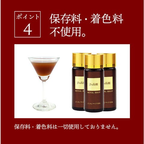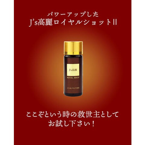 高濃度 高麗人参ドリンク J's 高麗ロイヤルショットは高麗人参に含まれるサポニンであるジンセノサイド約72.1mg/本 含有し、従来品より1.5倍とパワーアップ!
