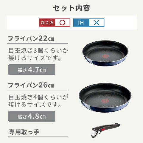 ガス火専用で最高ランクのコーティングで、エレガントなブルーの外面はエナメル仕上げ。キズや汚れに強く、美しい光沢が続きます。はじめての「取っ手のとれるティファール」にもおすすめの、フライパン22cm・26cmと、専用取っ手の3点セットです。