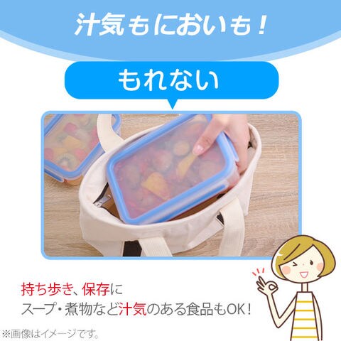 汁ものも、においも、もれない。 スープや煮物など、液体や汁気の多いお総菜を入れてももれません。