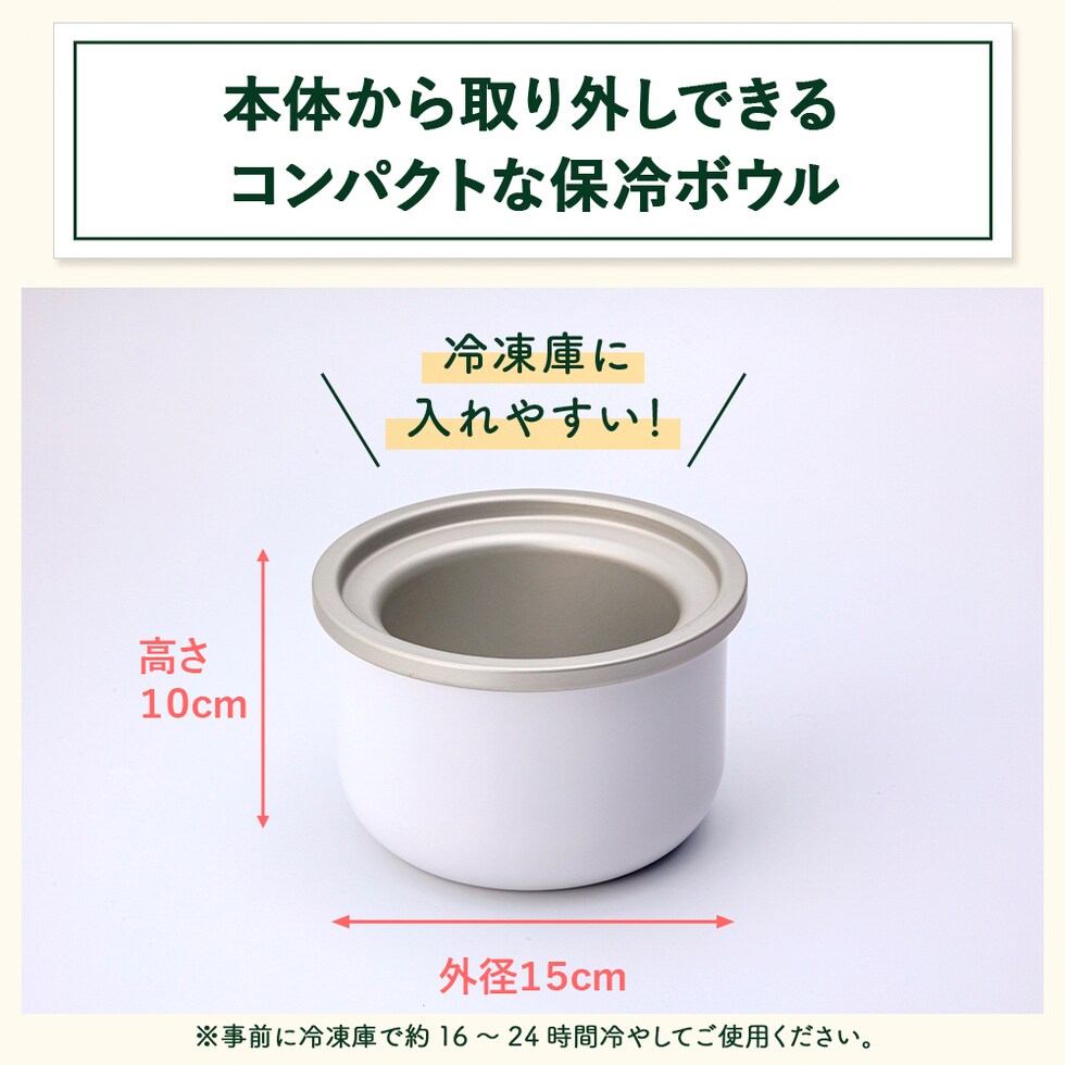 使い方はシンプル。事前に保冷ボウルを冷凍庫で24時以上間冷やしておき、あとは冷えた保冷ボウルに材料を入れてボタンを押すだけ。パドルが回転し、空気を含ませながら材料を少しずつ冷やしていくので、なめらかなアイスクリームが出来上がります。