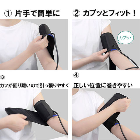 U字型の新形状「カプッとカフ」は腕に通す必要がなく、楽な姿勢のまま片手で腕に簡単装着。