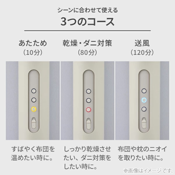 「あたため」「乾燥・ダニ対策」「送風」の計3つのコースを搭載。ワンタッチで挿し込むだけで、ランドリーに行く手間や消臭剤を吹きかける手間から解放されます。快眠のための習慣・環境づくりを365日サポートします。