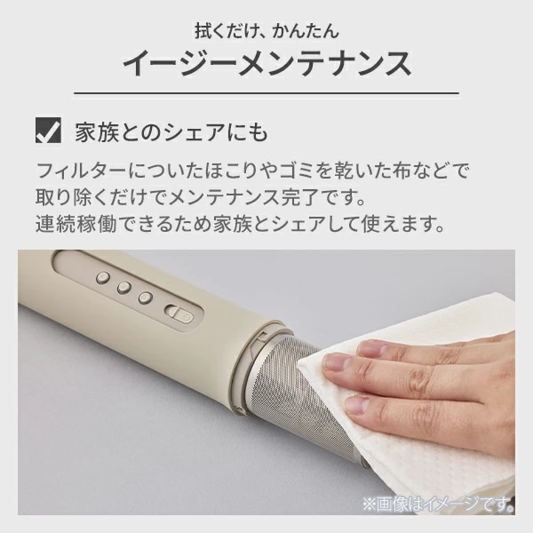 お手入れも簡単で、連続稼働できるため家族とシェアしてお使いいただけます。フィルターについたほこりやゴミを乾いた布などで取り除くだけでメンテナンス完了です。
