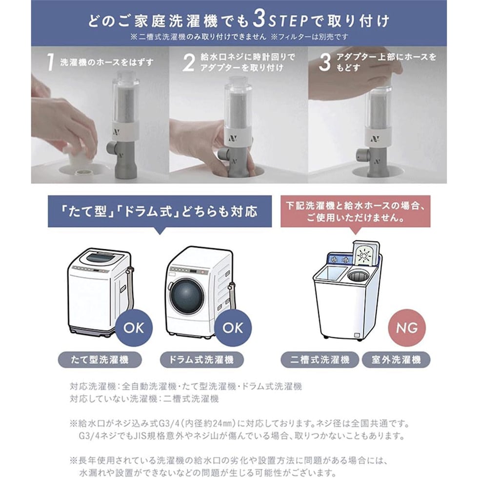 設置に工具は必要ありません。洗濯機とホースの間に簡単取り付け。