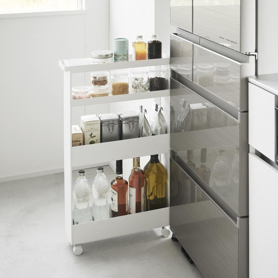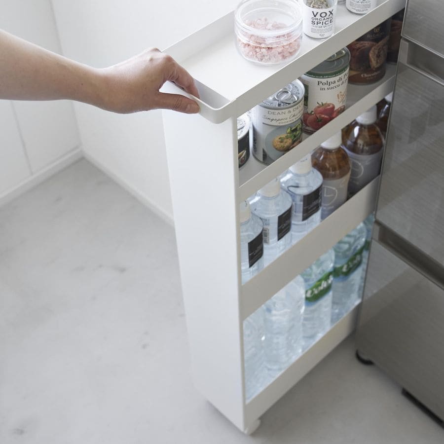 ・ジャムや雑貨などの小さい物からペットボトルや瓶類といった大きい物まで、冷蔵庫横などの隙間に省スペースに収納できます。