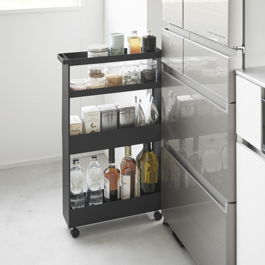 ・ジャムや雑貨などの小さい物からペットボトルや瓶類といった大きい物まで、冷蔵庫横などの隙間に省スペースに収納できます。