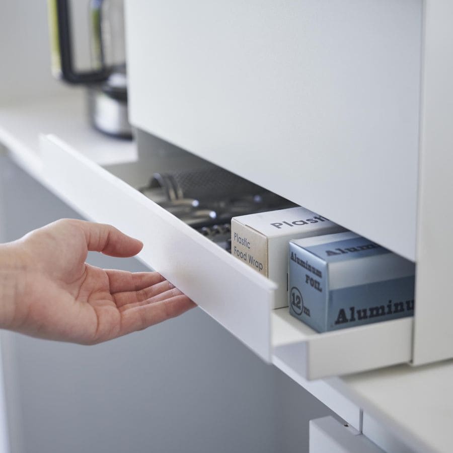 ・下段引き出しは浅めでラップや調理道具・トレーなどの収納に。