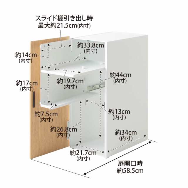 ●内寸サイズ:天板(凹み部分):約W20.8×D30.8cm スライド棚上段:約W19.7×D33.8×H14cm スライド棚下段:約W7.5×D33.8×H17cm スライド棚上段から底面までの収納部:約W13×D34×H44cm スライド棚下段から底面までの収納部:約W8.7×D34×H26.8cm