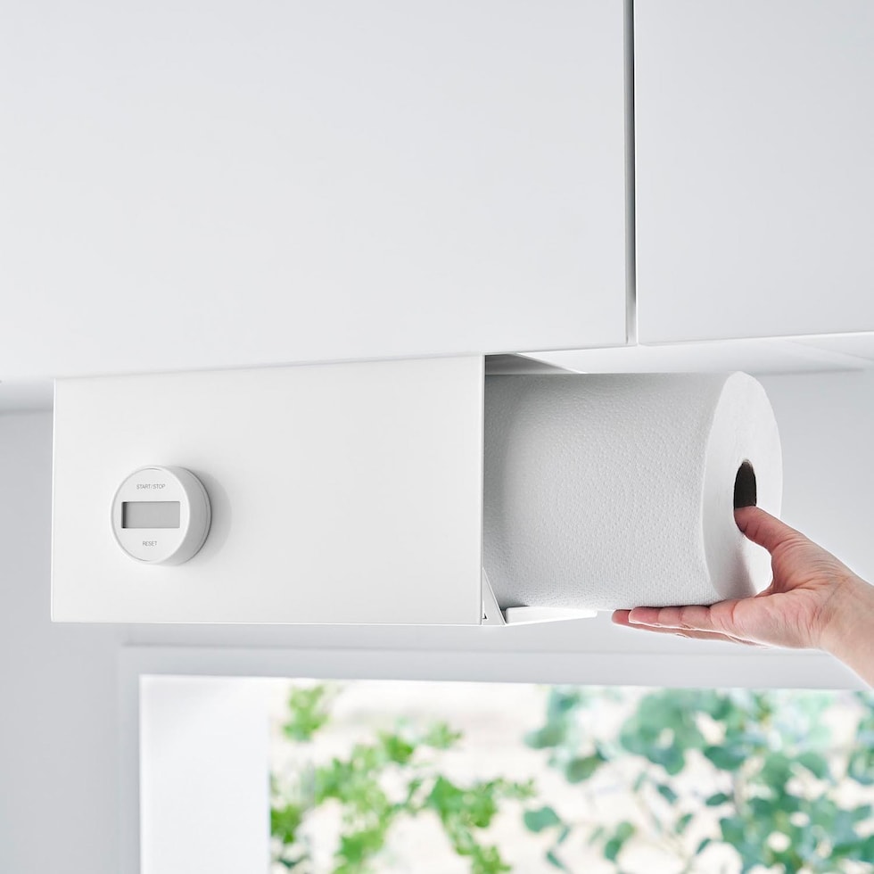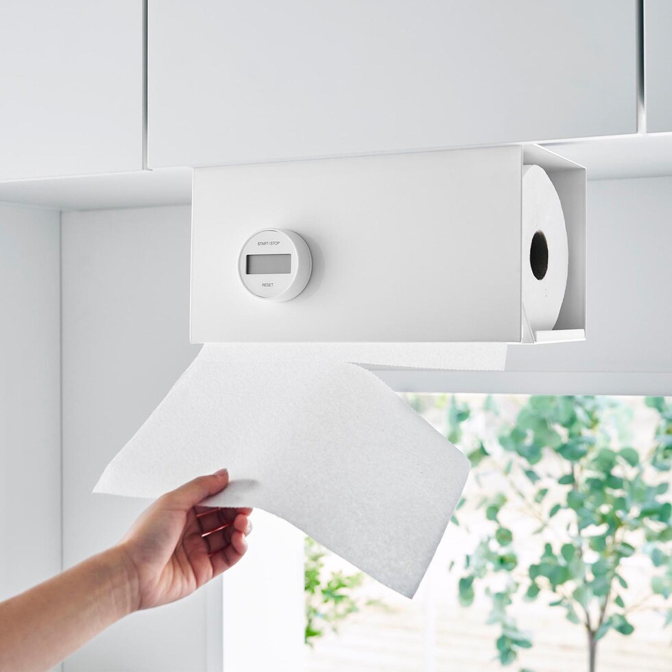 片手でカットできる!大判タイプのキッチンペーパーにも対応したカバー付きの戸棚下キッチンペーパーホルダー。丈夫なスチール製。