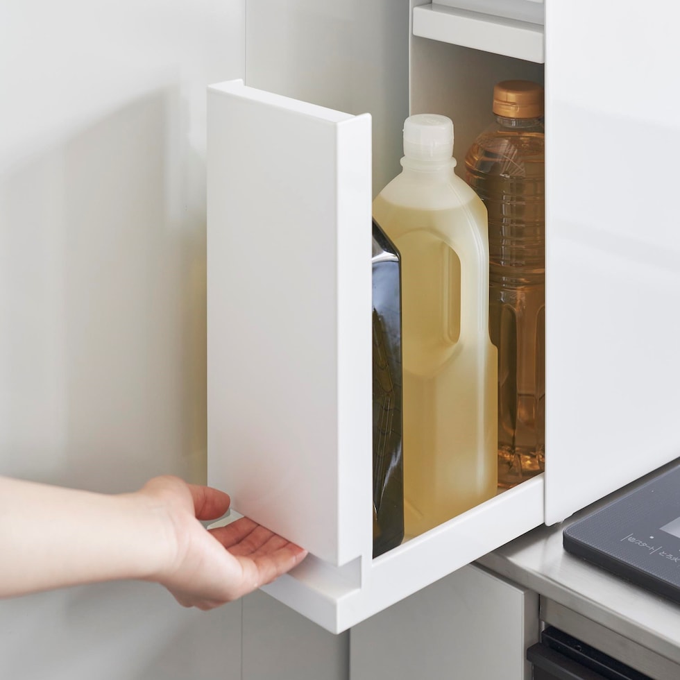 ・引き出し式で、油のボトル類も収納できる大容量の調味料ラック。