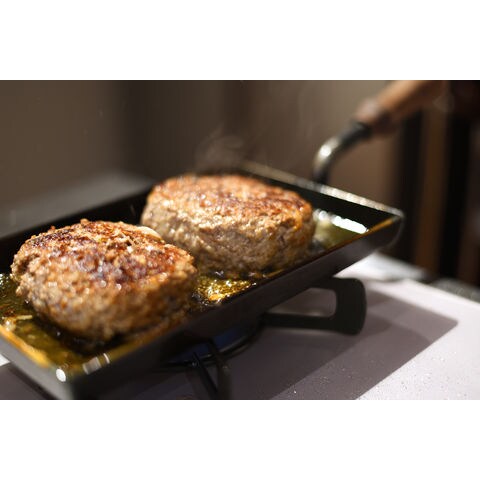 ポンドステーキがぴったり入るコンパクトサイズ。蒸し焼きもできる蓋付きタイプ。ハンバーグや餃子など料理の幅が広がります。