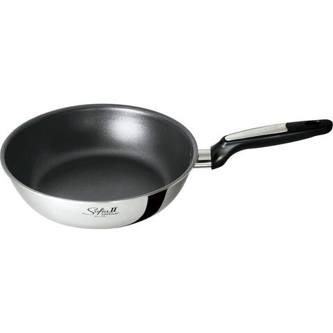 ステンレスとアルミの全面2層構造にナヴァロン3コート(高密度3層フッ素コーティング)と使いやすいハンドルを採用。IH対応でお求め安い価格も魅力