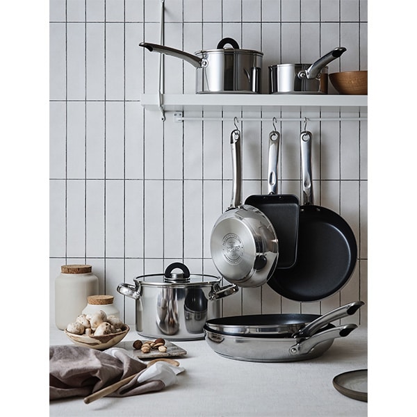 焦げ付きにくいノンステイック加工と熱くなりにくい中空ハンドル。