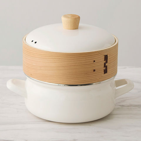 蒸籠(せいろ)が付いた、可愛いサイズの両手鍋です。蒸籠(せいろ)を外せば、普通の鍋としてお使いいただけます。ホーローは鉄素材だから熱伝導と保温性に優れ、表面ガラス質なので汚れにくくお手入簡単です。色、光沢を末永く保ちます。