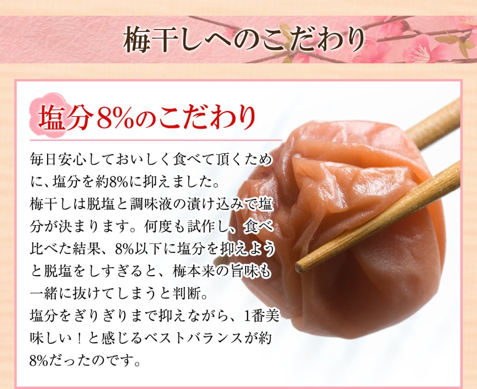 毎日梅干しを食べる方や健康に気を付けている方にも安心して召し上がっていただける商品です。
