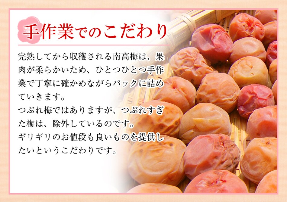 紀州南高梅は皮が柔らかいため、手作業で丁寧に作業していても皮が裂けたり、形がくずれてしまったりするのでつぶれ梅になってしまいます。潰れていても味の方は普通のはちみつ梅と変わりはありません。