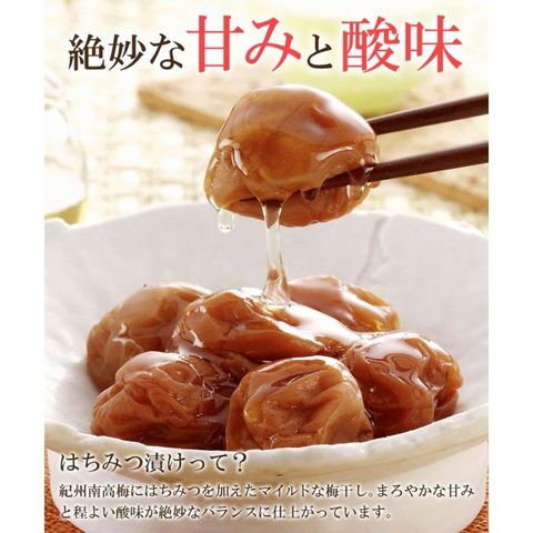 【原材料名】梅、漬け原料(食塩、還元水飴、蜂蜜、酒精、調味料(アミノ酸等)、甘味料(スクラロース)、ビタミンB1 【賞味期間】パッケージに記載