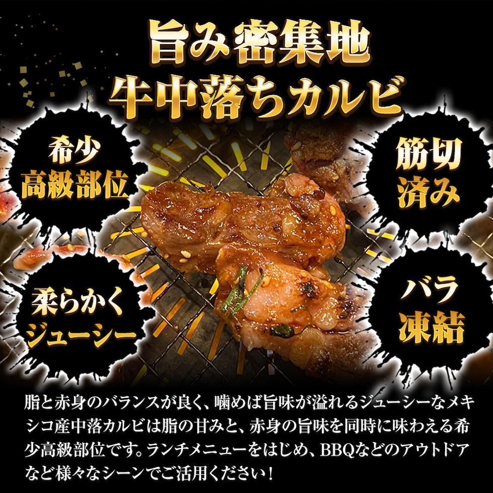 脂と赤身のバランスが良く、噛めば旨味が溢れるジューシーなメキシコ産中落カルビは脂の甘みと、赤身の旨味を同時に味わえる希少高級部位です。
