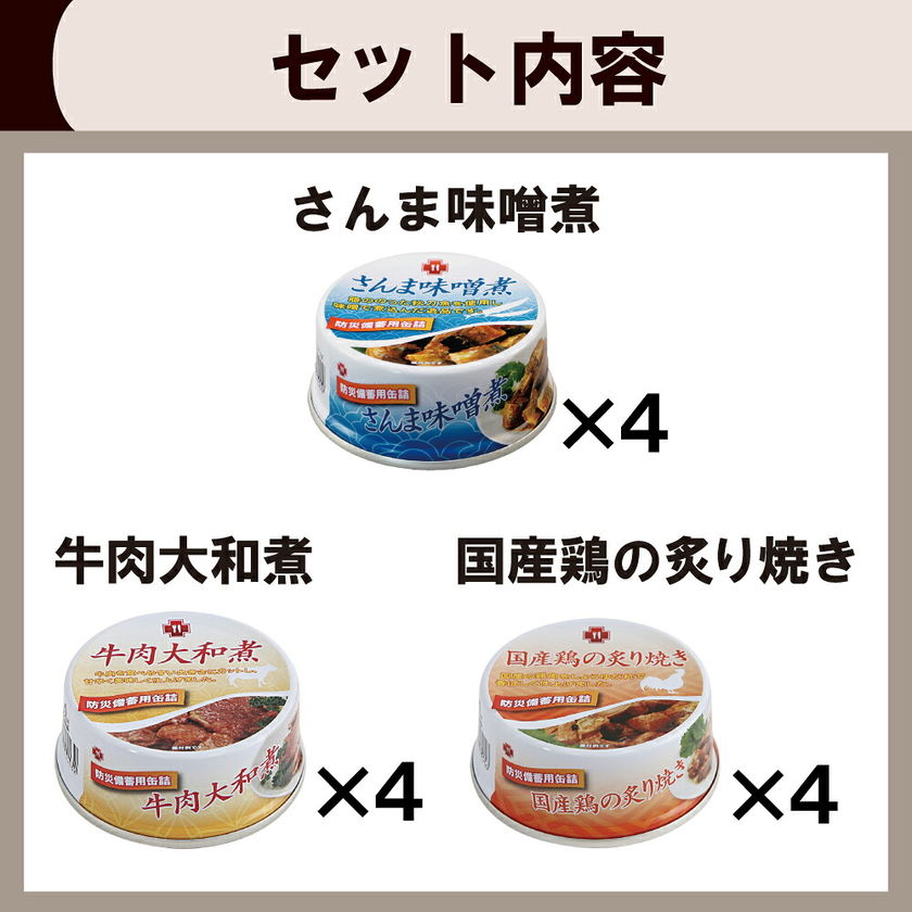 非常食セット 7年保存 缶詰 3種類 12缶セット 牛肉大和煮/国産鶏の炙り焼き/さんま味噌煮 缶詰め 保存食 非常食 防災食 防災グッズ 防災セット まとめ買い おかず 防災用品 企業 団体 帰宅困難者対策 長期保存 災害備蓄