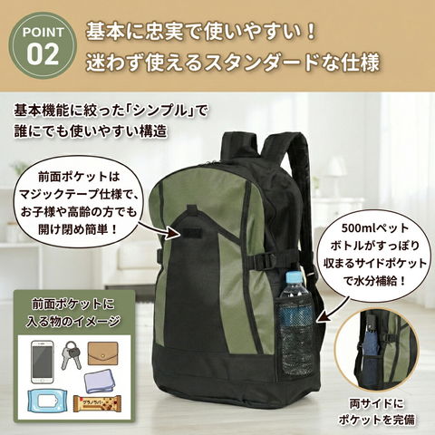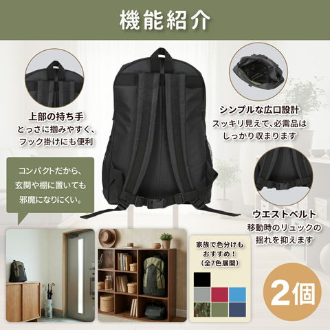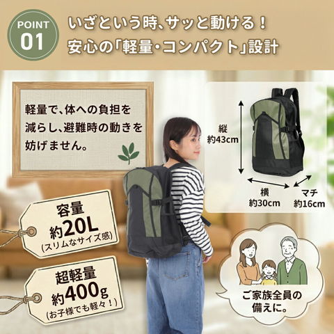 | 防災リュック | 2 | カラー:ブラック/ブルー/ワイン/迷彩/カーキ/グレー/ネイビー サイズ:(約)幅300×高430×マチ160mm 本体重量:(約)400g 容量:(約)20L 【ご注意】 製造段階でリュック内部に黒色塗料剥げや転写汚れがある場合がございます。 品質に問題はございませんのでご安心ください。 |