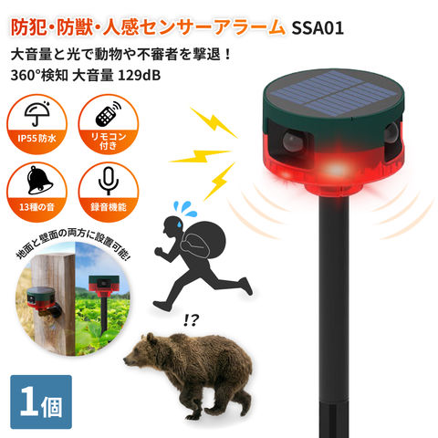 ソーラー赤外線センサーアラーム 1個 防犯アラーム 人感センサー ソーラー 防獣 防犯 害獣撃退器 警報器 アラーム リモコン 防水 録音 畑 庭 熊 猪 熊対策 熊よけ 赤外線 SSA01 EVERSAFE