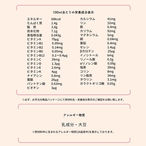乳成分 8.5g、調整脂肪 3.5g、オリゴ糖 0.1g、ビタミン・ミネラル等 0.1g