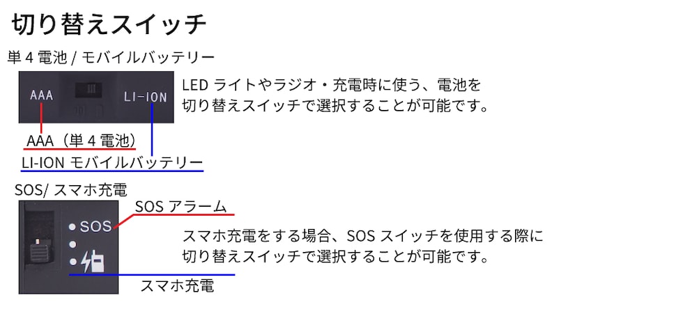 緊急時にスイッチを切り替える事によって、SOSライトと大音量のサイレン音がなります。