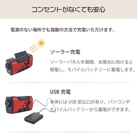 手回し / ソーラー / 乾電池 / USB での充電が可能です。