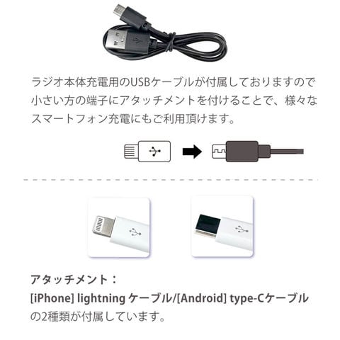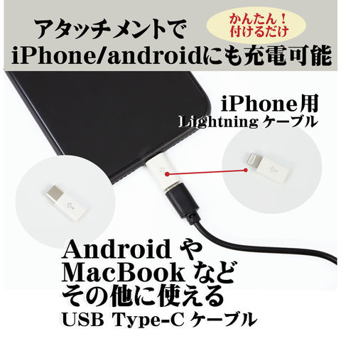 USBケーブル・スマホ用の充電アタッチメントが付属します。