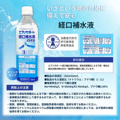 ・エブリサポート経口補水液ORSは、感染性胃腸炎による下痢・嘔吐の脱水状態の際の水分・電解質の補給に適しています。