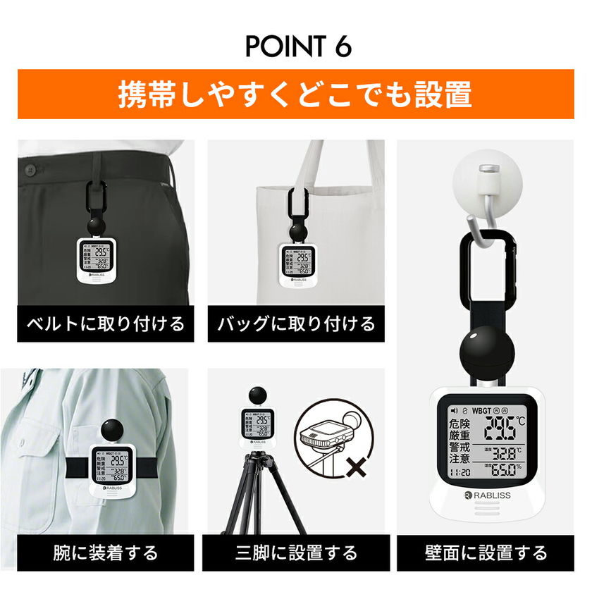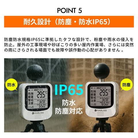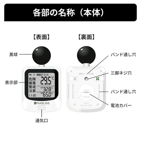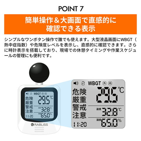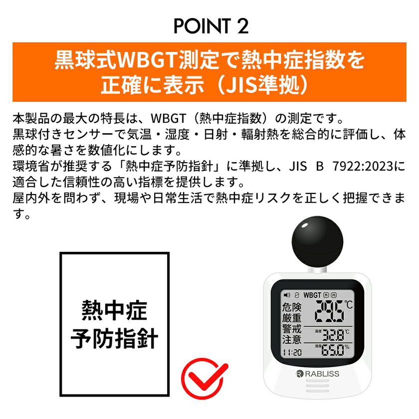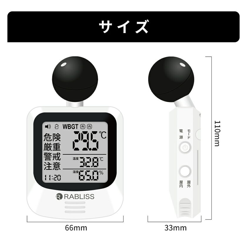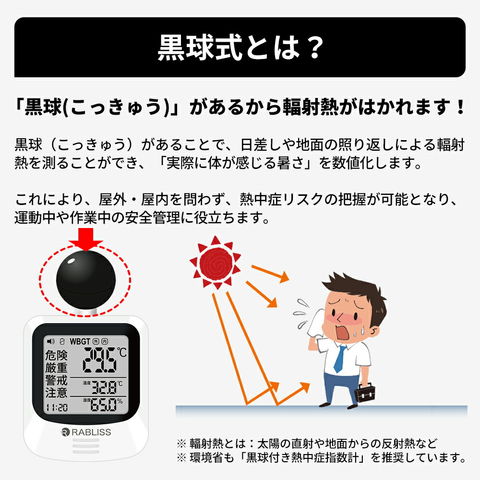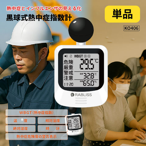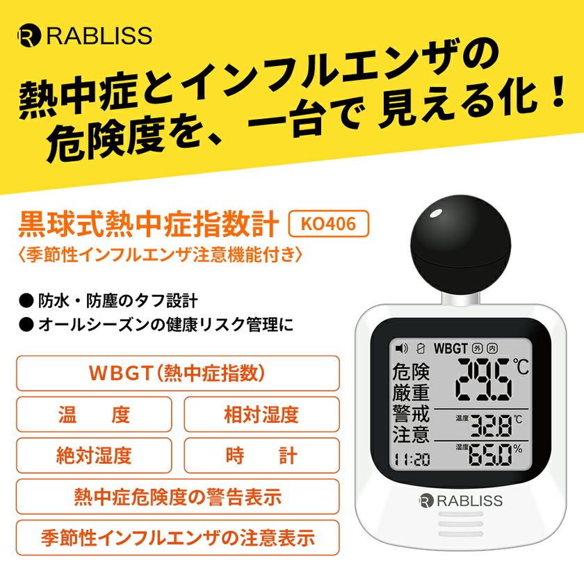 黒球式熱中症指数計 1個 熱中症対策 インフルエンザ注意機能 感染症対策 絶対湿度 WBGT 黒球式 JIS準拠 IP65 防塵防水 まとめ買い オールシーズン 団体用 熱中症指数計 リスク管理 熱中症 KO406 RABLISS