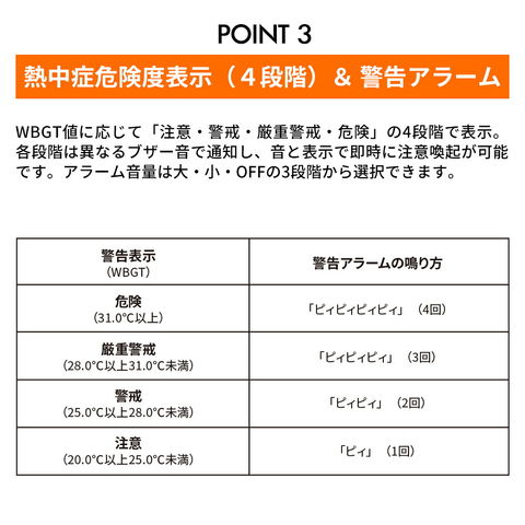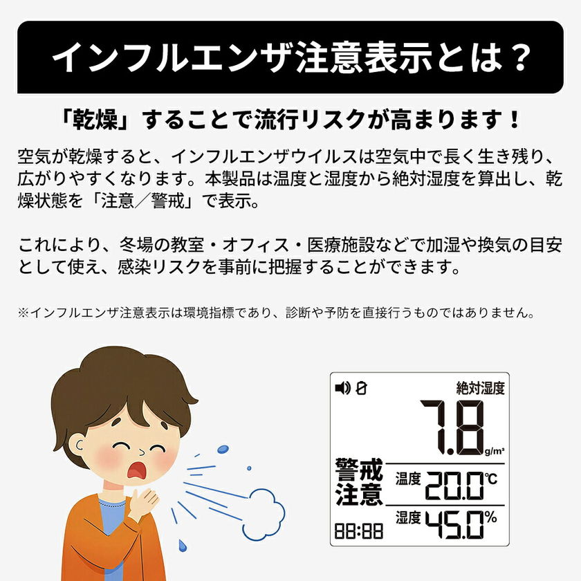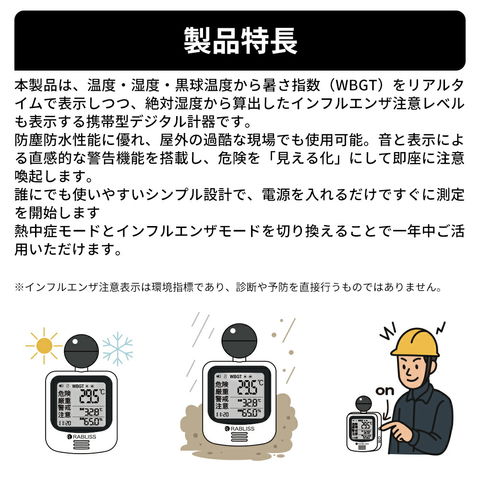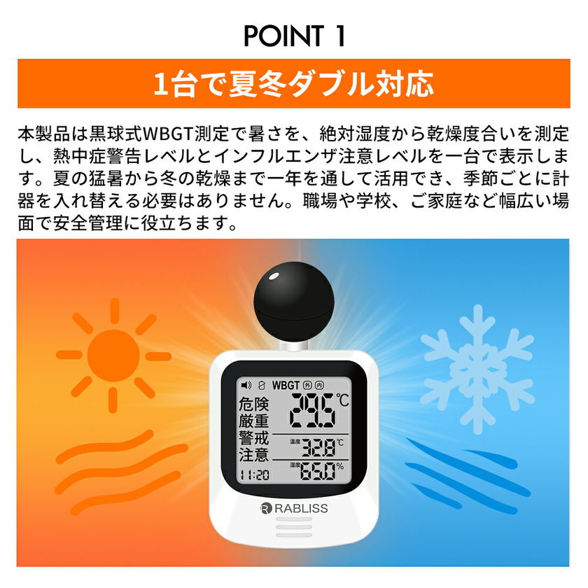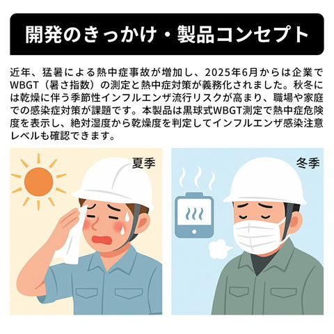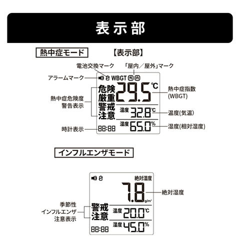 本製品は黒球式WBGT測定で暑さ危険度を表示し、絶対湿度から乾燥度を判定してインフルエンザ注意レベルも確認できます。