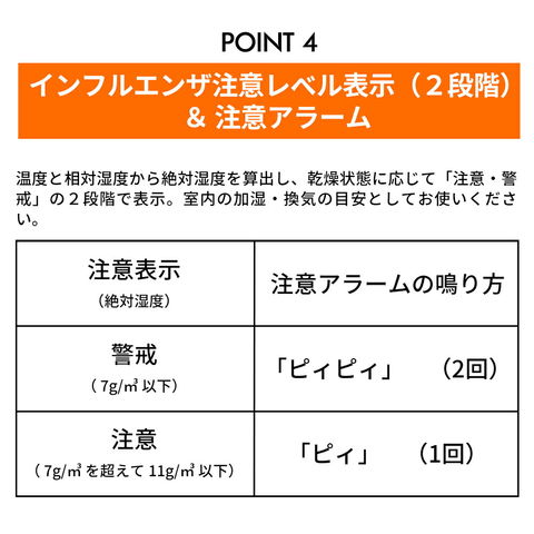 本製品は温度と相対湿度から絶対湿度を算出し、乾燥状態に応じて「注意・警戒」を表示します。