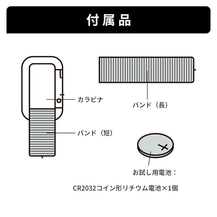 付属品:カラビナ、バンド(長短各1本)、取扱説明書、お試し用電池:CR2032 コイン形リチウム電池×1個