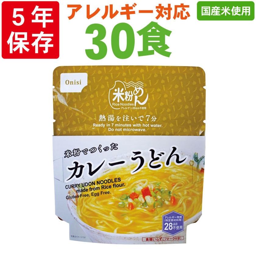 尾西食品「米粉でつくったカレーうどん 30食セット」5年保存 非常食 米粉麺 アレルギー対応 アレルギー物質28品目不使用 食器不要 フォーク付(onisi 尾西 アルファ米 100%国産米使用 防災食 非常用 災害用